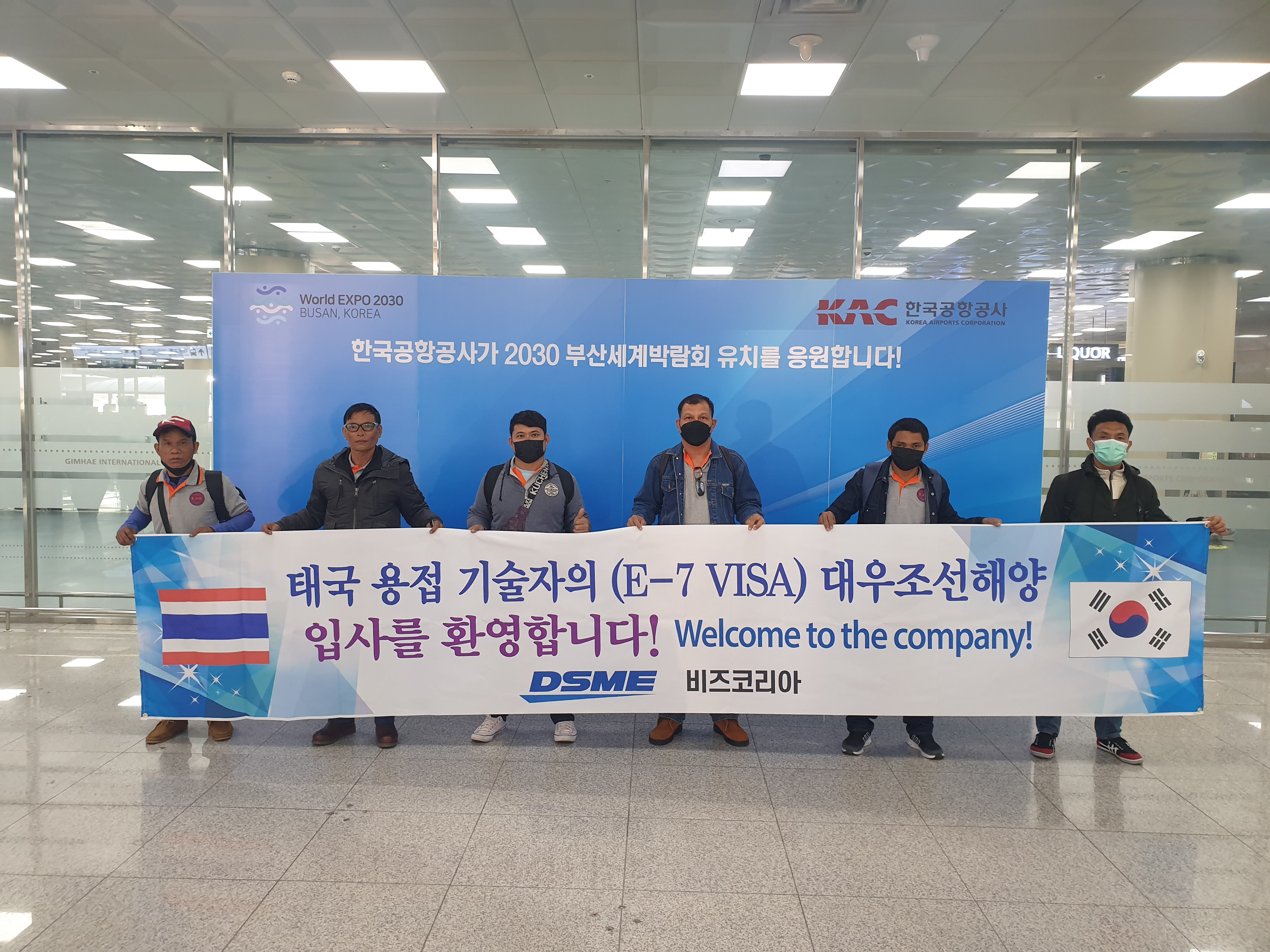 지난 8월 태국 현지에서 이루어진 조선해양플랜트협회의 기량검증을 통과한 용접공 중 6명이 1차로 E-7 비자를 취득하고 2월 28일 김해공항을 통해 입국하였습니다.